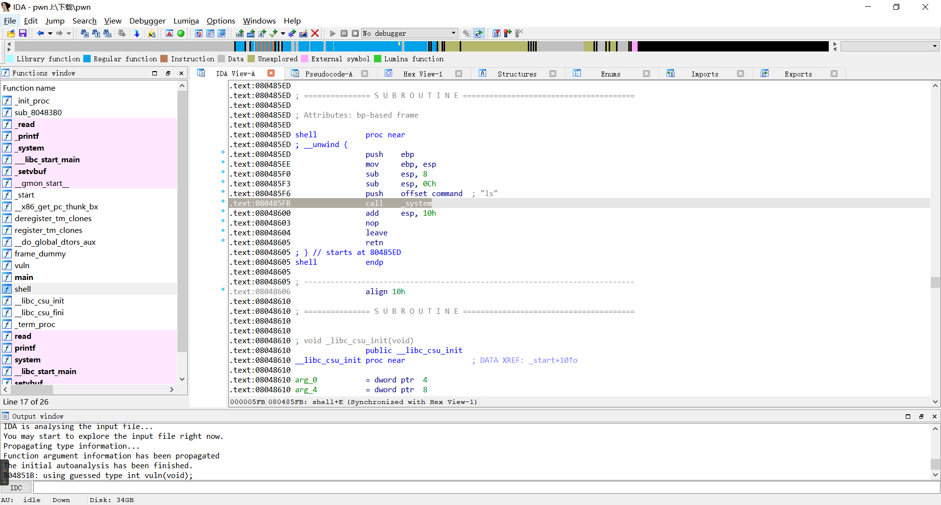 发现了半个system。第二次输入时利用连续两次的leave ret; (函数本身带有leave ret;)将返回地址改成从esp+4的地方开始执行,此时我们在第二次输入时在esp+4的地方写上system地址+ 0 + /bin/sh的地址 + “/bin/sh” 就可以了