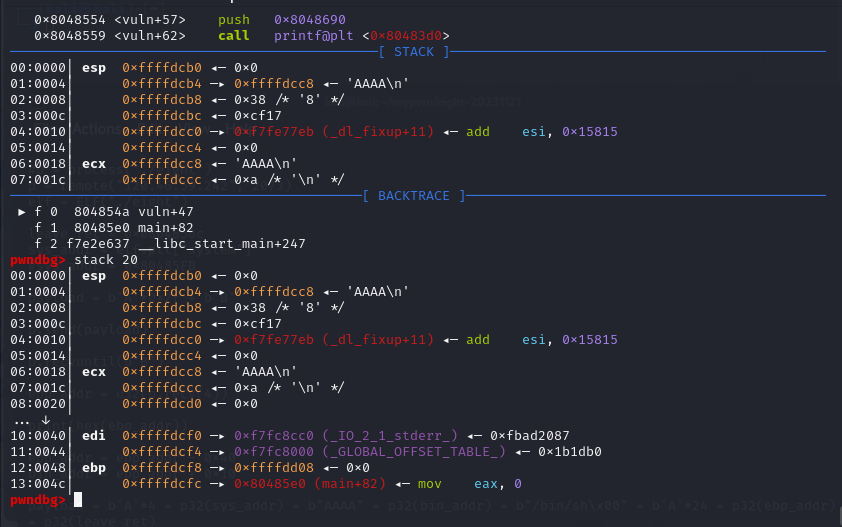 在第一次gets时输入AAAAAAAA后栈的状态如下: