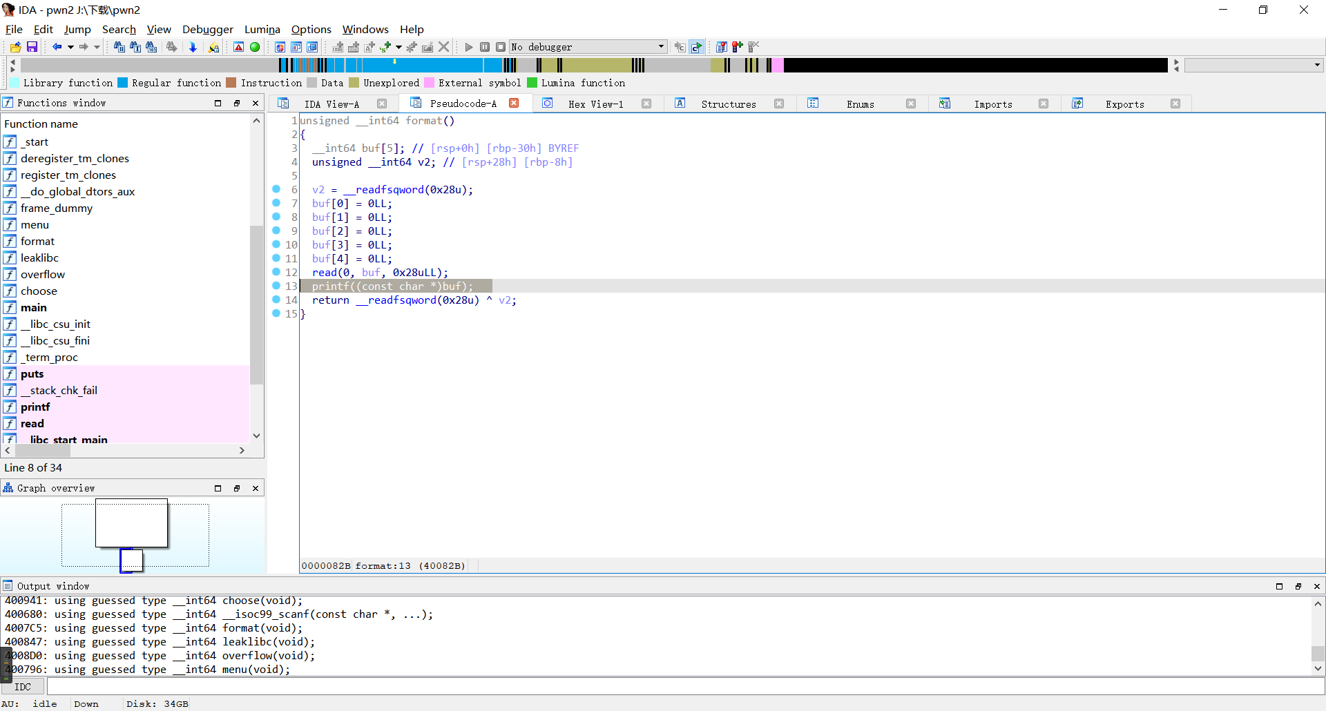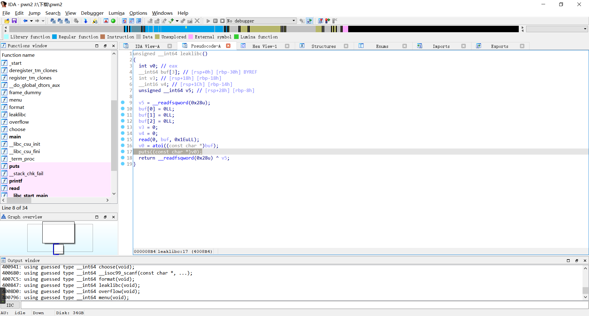 v0原本是int型,在puts中变成了const char * 型,导致地址任意读,用于泄漏libc基地址