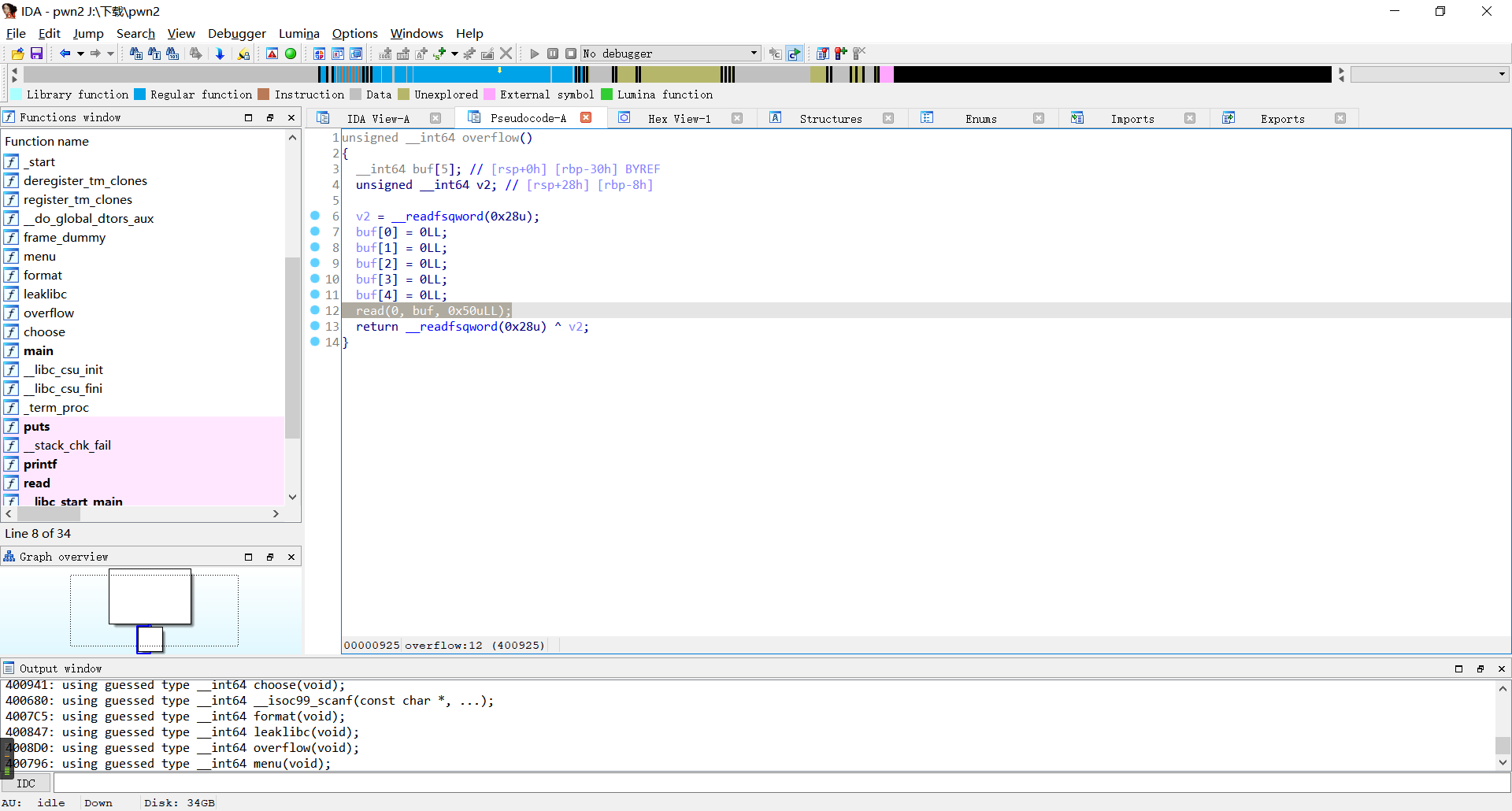 发现主要逻辑,且两次输入都只溢出了0x8,明显的栈迁移题目。