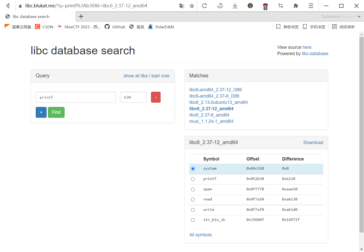输入后获得libc版本(多个),常用函数偏移量都显示出来了,你甚至可以下载编译好的libc文件,当然如果有多个版本就看你运气了,不过相近版本的libc的偏移地址应该差别不大。对于这个网站的评价是:不如原—。