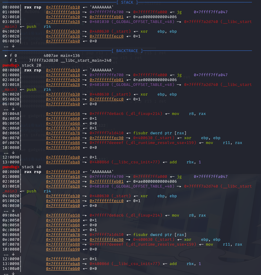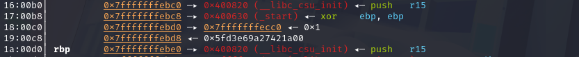我们注意到canary值(特征是尾号00)在0x19的位置(最左边显示)且stcak中还有7个地址0x7(0x0和下面rsp重复),所以偏移应该是0x19+0x7=32,但是由于是从0x0开始,所以应该最终偏移应该是32-1=1(虽然不知道怎么搞对不对)
