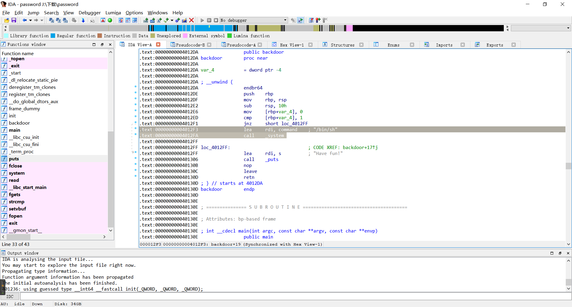 发现后门函数但是没有”/bin/sh”。