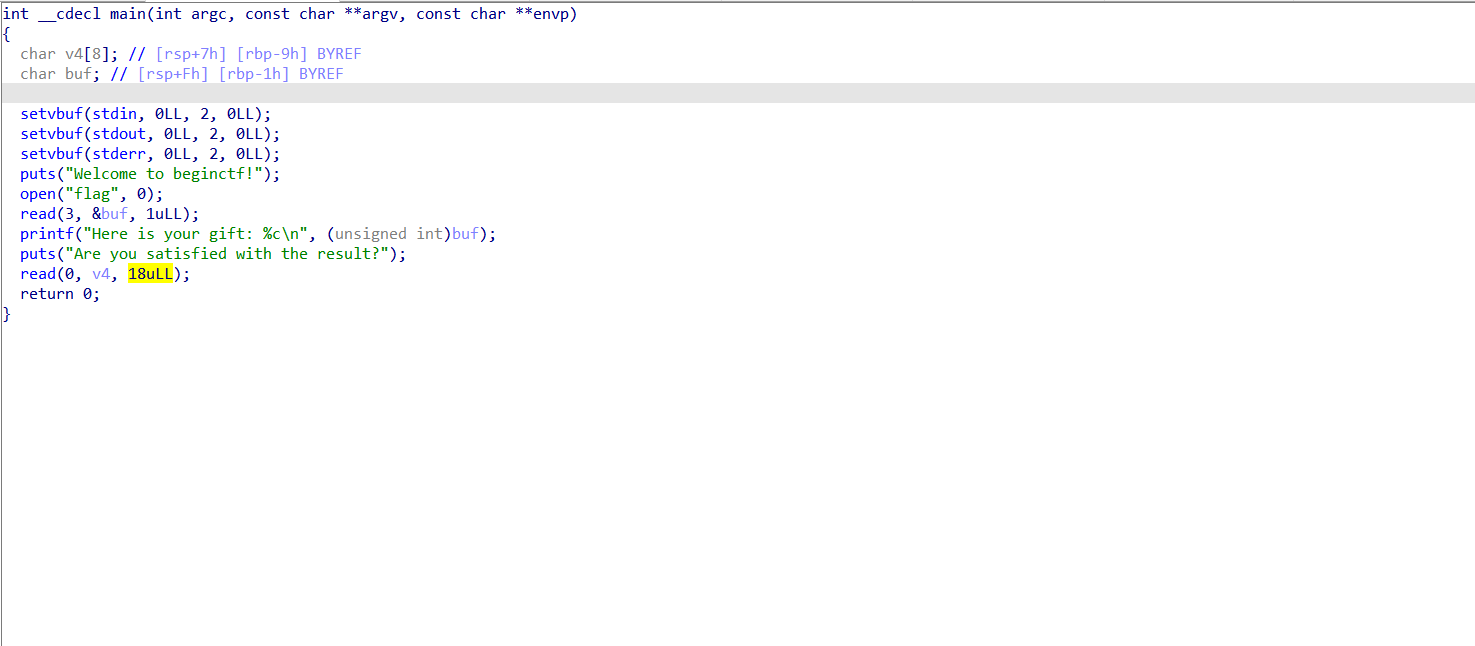 我们可以很轻易的看出在read函数中有8个字节(实际是9个字节)的溢出,当你输入18个A后你就会发现程序流重新进入了main函数进行,这对一个坚信唯物主义的计算机人来说实在是太过于诡异,真是凭空冒出来的循环。