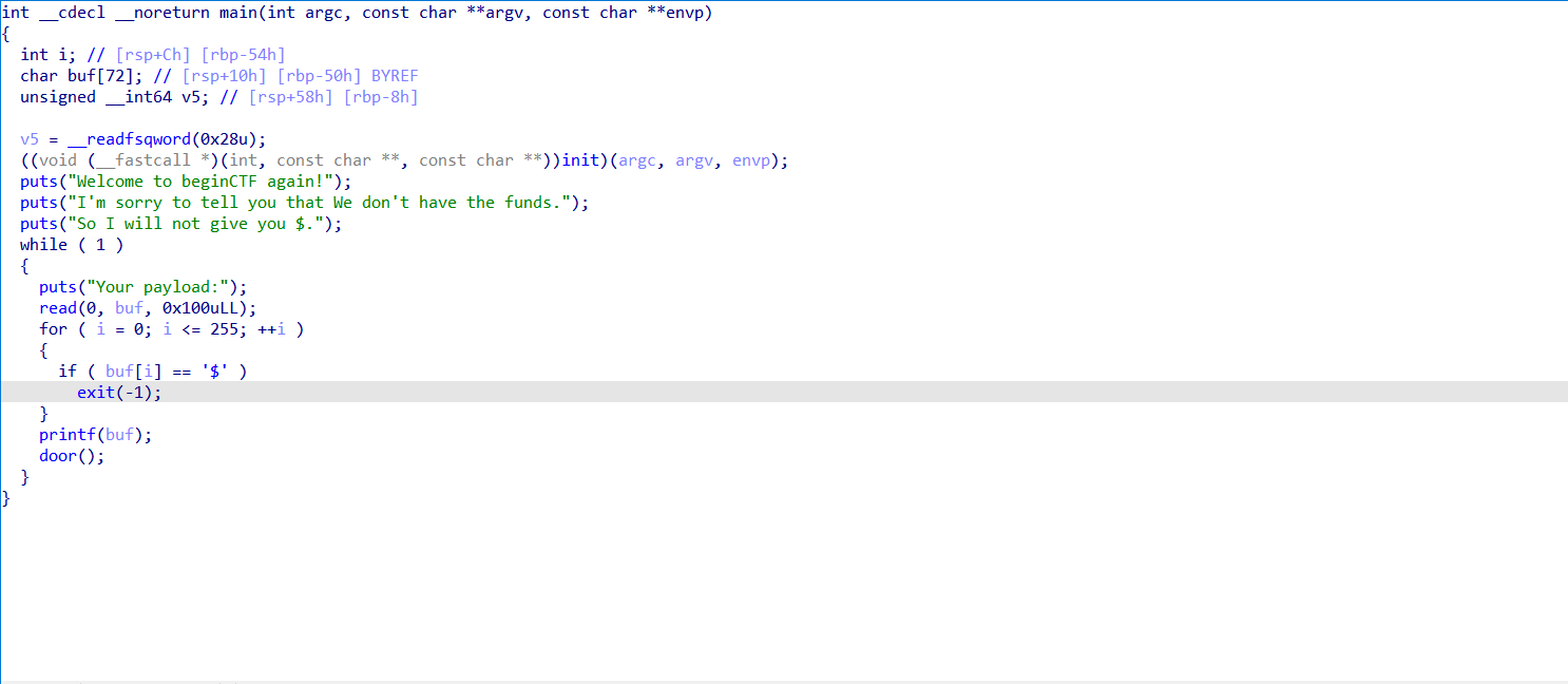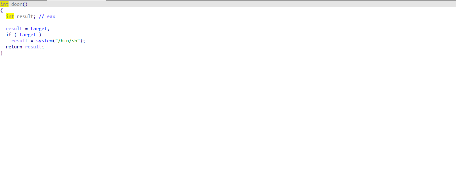 在main函数中我们发现了字符串格式化漏洞,但是他禁止我们输入的字符串中包含字符$。这使得我们非常不方便使用字符串格式化漏洞。door中的target是bss段的数据,在开始的时候值为0。我们的目的是在target中写入数据来使得system可以被执行(实际上后来发现似乎可以直接暴露PIE和canary,然后直接溢出劫持程序流绕开判断直接执行system)。main函数中有无限循环,让我们有多次输入机会。