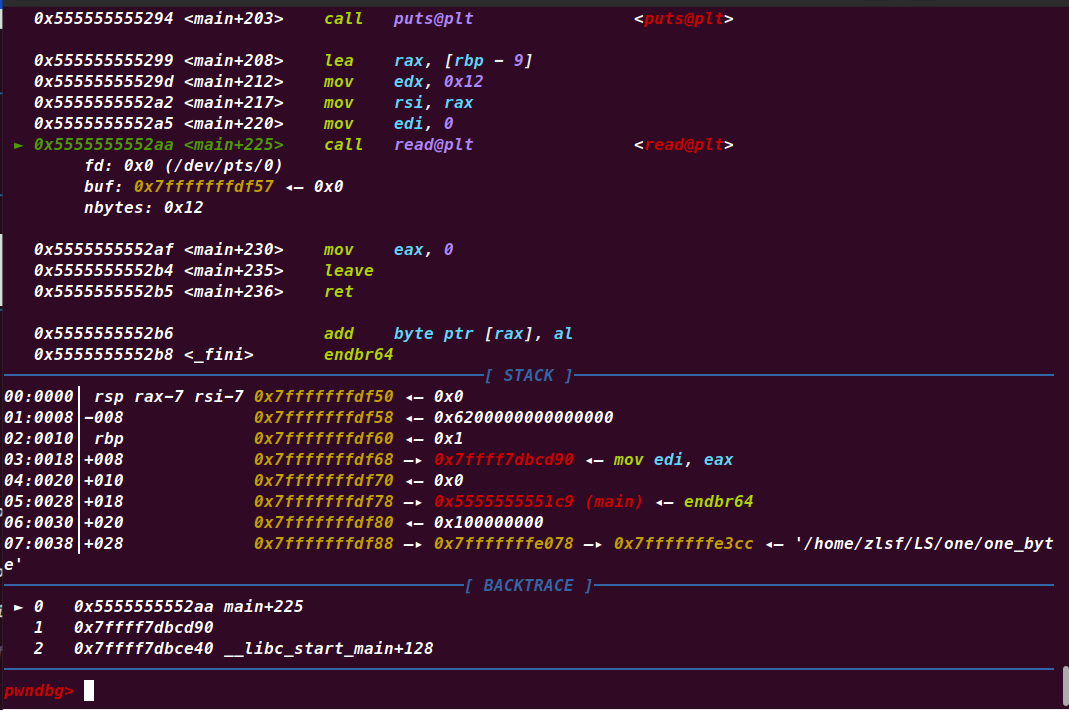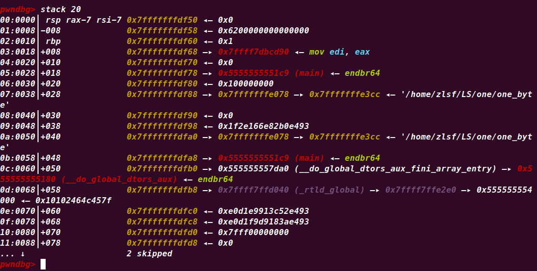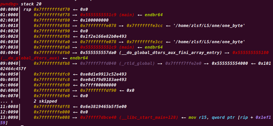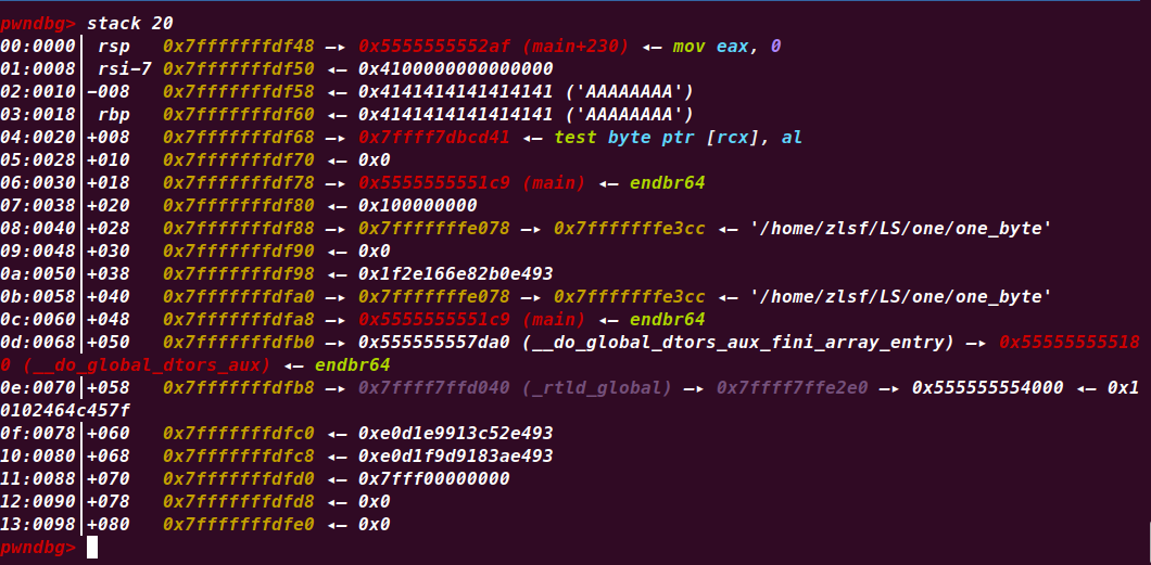 rsp此时正好和main的执行地址差8字节,可以说这两句汇编代码直接决定了会重新执行main函数。所以说程序在没有循环代码时出现了循环原来是这个原因。只要我们一直保持返回地址的最后一个字节是0x41,程序就会一直重新循环,而且这种循环似乎只会格式化栈区,而不会影响到其他存储区域比如.bss段。
