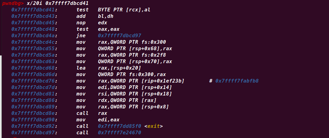 此时原本的返回地址0x7ffff7dbcd90变成了现在的0x7ffff7dbcd41,最后一个字节被覆盖成了A(0x41),我们看看0x7ffff7dbcd41对于的汇编代码: