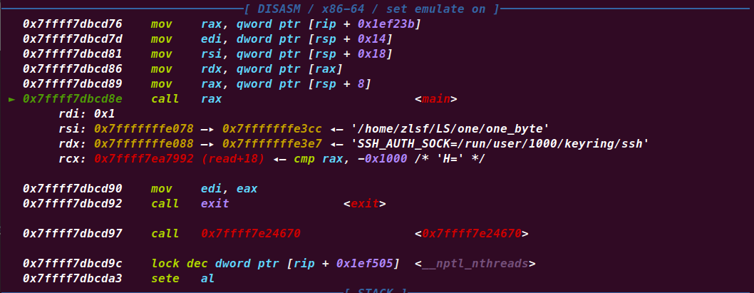 当我们执行到0x7ffff7dbcd8e这一句的时候他执行了rax中的地址,也就是将执行流跳转到了main函数,为什么此时rax中会有main函数的地址?我们可以看看0x7ffff7dbcd89这一句,他将rsp的地址+8,然后取出其中的值写入main函数,我们此时看看rsp在哪里: