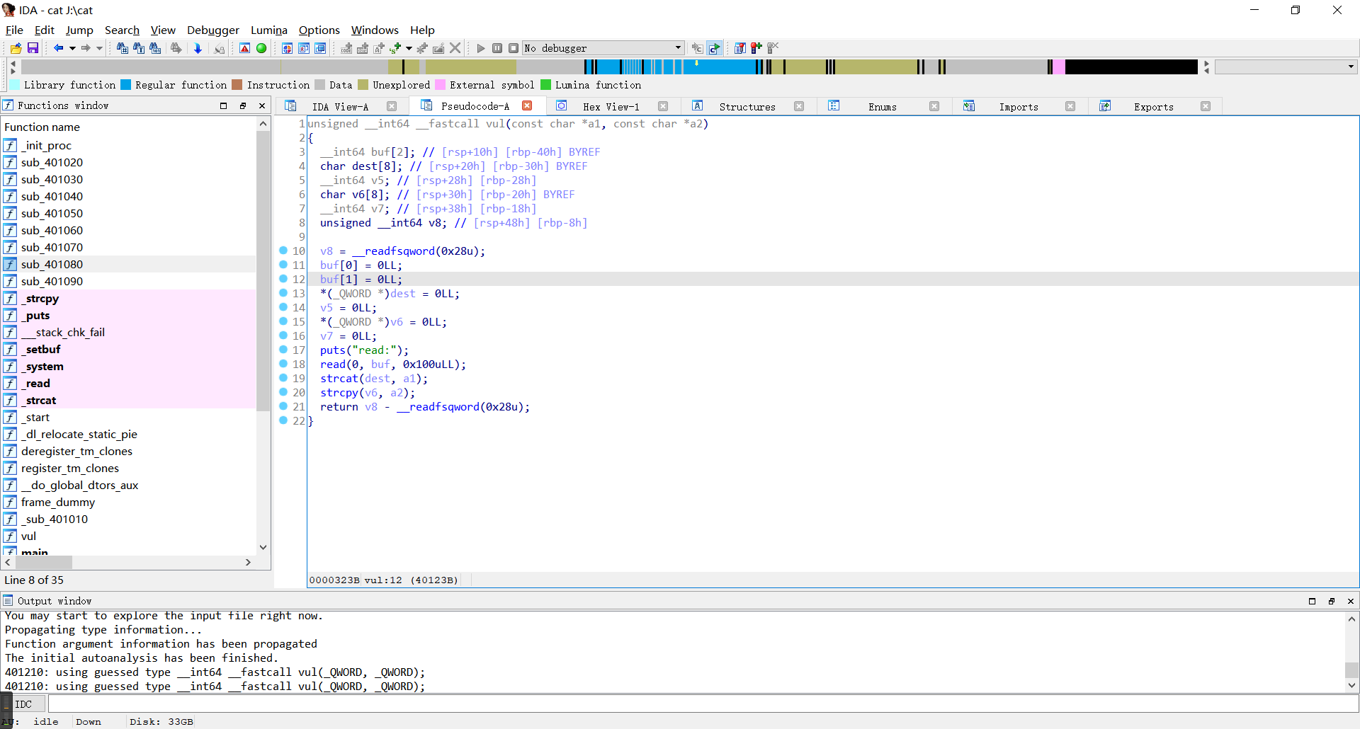 在这个题目中我们无法知道canary的值,但是我们有strcat和strcpy这两个函数。