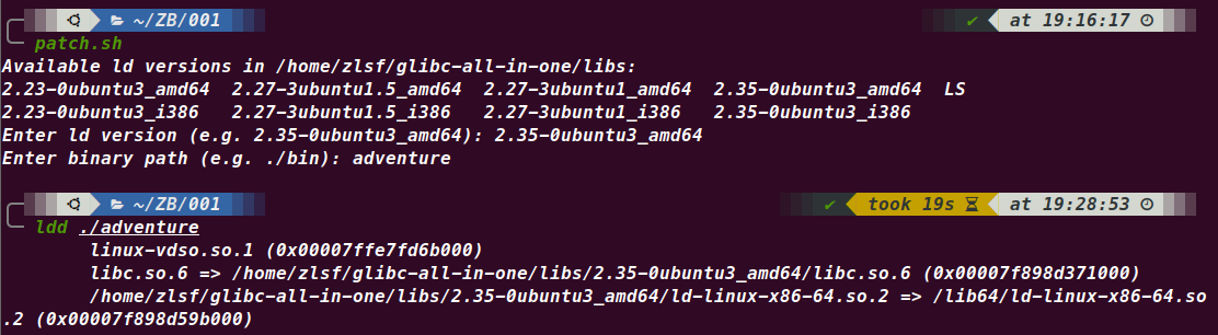 | #!/bin/bash echo "Available ld versions in /home/你的用户名/glibc-all-in-one/libs:" ls /home/你的用户名/glibc-all-in-one/libs read -p "Enter ld version (e.g. 2.35-0ubuntu3_amd64): " ld_version read -p "Enter binary path (e.g. ./bin): " binary_path patchelf --set-interpreter "/home/你的用户名/glibc-all-in-one/libs/${ld_version}/ld-linux-x86-64.so.2" "${binary_path}" patchelf --set-rpath "/home/你的用户名/glibc-all-in-one/libs/${ld_version}/" "${binary_path}"
