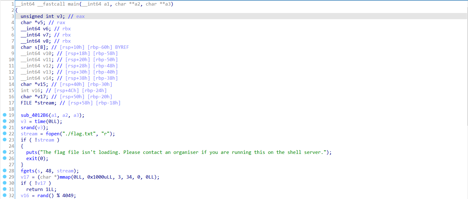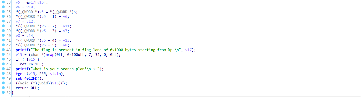 代码似乎略有一点复杂,我们现在大概只知道程序读取了flag到内存当中,且程序中有两段可执行内存。