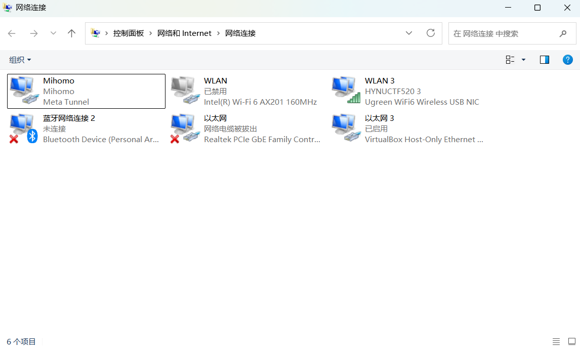 我们可以注意到其中的 Mihomo 是 Clash Verge 新建的虚拟网卡。