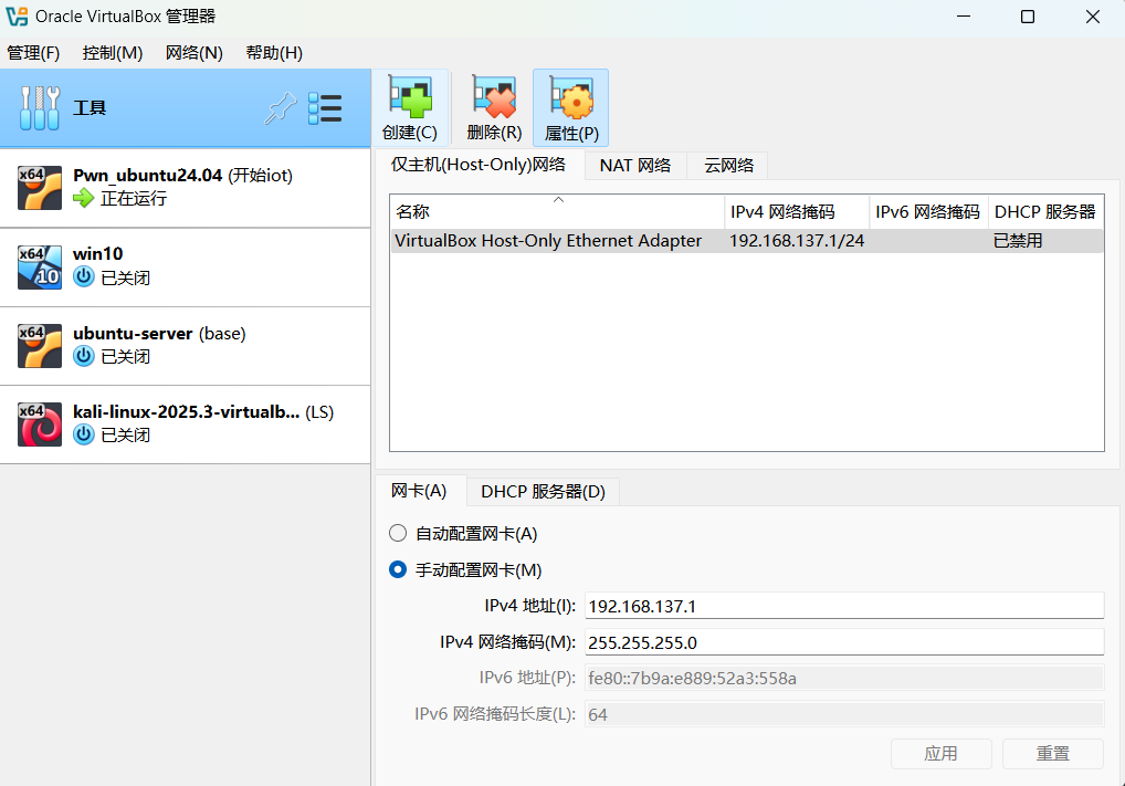 记得在之前 virtualbox 管理器的工具选项卡中存在网络子选项卡设置成警告中的静态 ip 并禁用 DHCP 服务器。