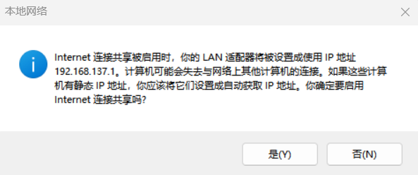 检查 ip 是否正确,比如我刚刚警告弹窗显示的是 192.168.137.0 网段的,我的网卡也应该拿到了相应的地址: